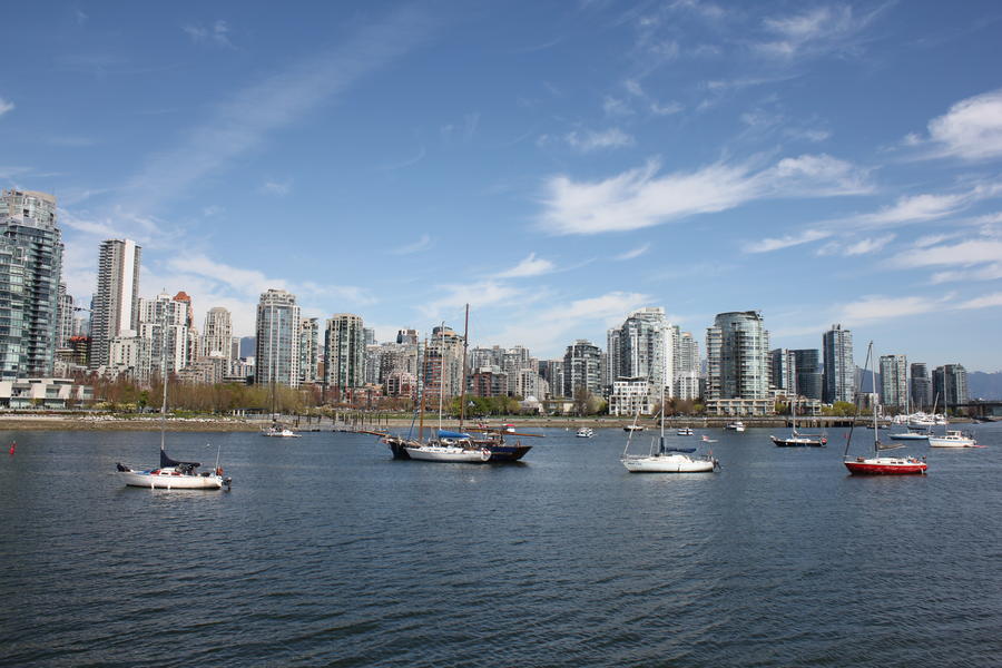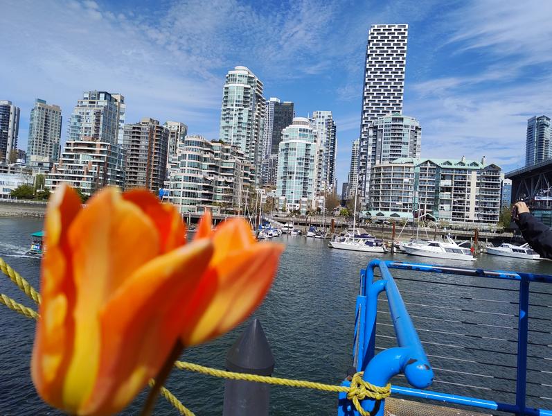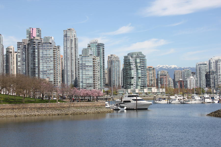 Nachdem ich eine große Runde durch den VanDusen-Garten gedreht hatte, ging es wieder zurück an die Bucht, dort weiter dem Uferradweg entlang bis nach Grandville Island. Dort habe ich die berühmte Granville Island Markthalle besucht - es gibt dort eine riesige Auswahl von unterschiedlichen Märkten. Vielleicht lag es daran, dass es total überlaufen war, aber mir hatten andere Markthallen, z.B. in Toronto oder Budapest, viel besser gefallen. Zum Glück hab ich aber trotzdem ein Mittagessen gefunden, das ich dort auf der Terasse direkt am Wasser essen konnte.