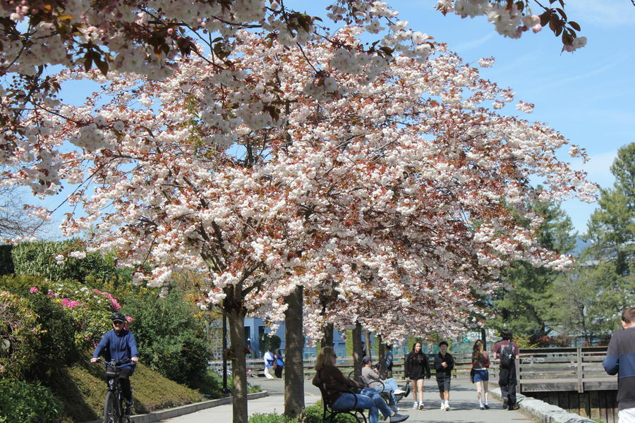 Von dort ging es auf dem Uferradweg weiter, bis ich über die Burrard-Brücke als in Fahrtrichtung letzte Brücke wieder zurück nach Downtown bin. Dort ging es dem Strand entlang weiter bis zum Stanley-Park, dem größten Stadtpark Kanadas. Dieser ist (bis auf die eine kurze Seite) komplett vom Meer umgeben und wird von einem Fuß- und Radweg, dem Seawall, umfasst. Ich habe auf dem Seawall den PArk umrundet und dabei festgestellt, dass Radfahrer dies nur gegen den Uhrzeigersinn dürfen. Leider war der Park und der Radweg bei dem guten Wetter total überfüllt - was aber weder die Schönheit des Parkes noch die der Aussicht gemindert hat. Unterwegs habe ich ab und zu angehalten, mich auf eine Bank gesetzt und das Wetter genossen (und natürlich Fotos gemacht). Nach der Parkumrundung ging es weiter an der Nordküste von Downtown, mit einer Pause am Vancouver Harbour Flight Centre, dort nochmal Wasserflugzeuge gucken. Von dort ging es nach Gastown, ein bisschen bummeln und Abendessen. Nach fast 45km auf dem Rad hatte ich Downtown und den Stanley-Park umrundet und einen Abstecher den Berg hoch in den VanDusen-Garten gemacht - es wurde Zeit fürs Bett.
