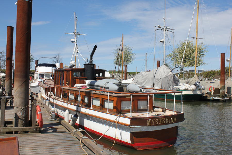 Nachdem ich morgens mein Fahrrad vom Vortag abgegeben hatte, wollte ich es etwas ruhiger angehen lassen als die ersten beiden Tage und habe mir ein Tagesticket für die Falls Creek-Fähren geholt, mit denen kann man den Falls Creek, den ich ja auf beiden Seiten zu Fuß bzw. mit dem Rad schon ausführlich erkundet hatte, vom Wasser aus erkunden. Zunächst ließ ich mich den ganzen Creek bis zum äußerten Punkt, dem Elsje Point fahren. Die Fähre legt dort an einem alten Pier an, der eine Ausstellung alter historischer Schiffe beinhaltet.