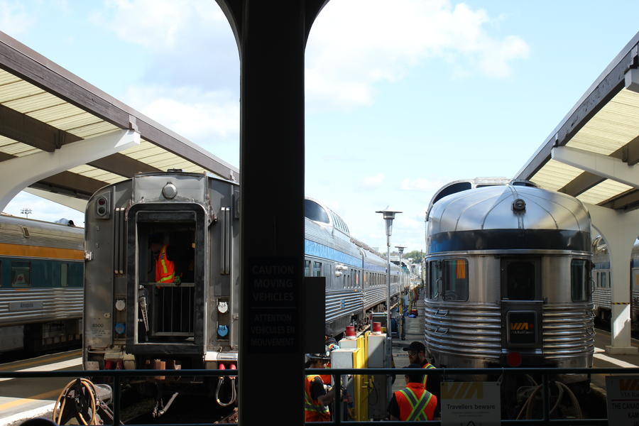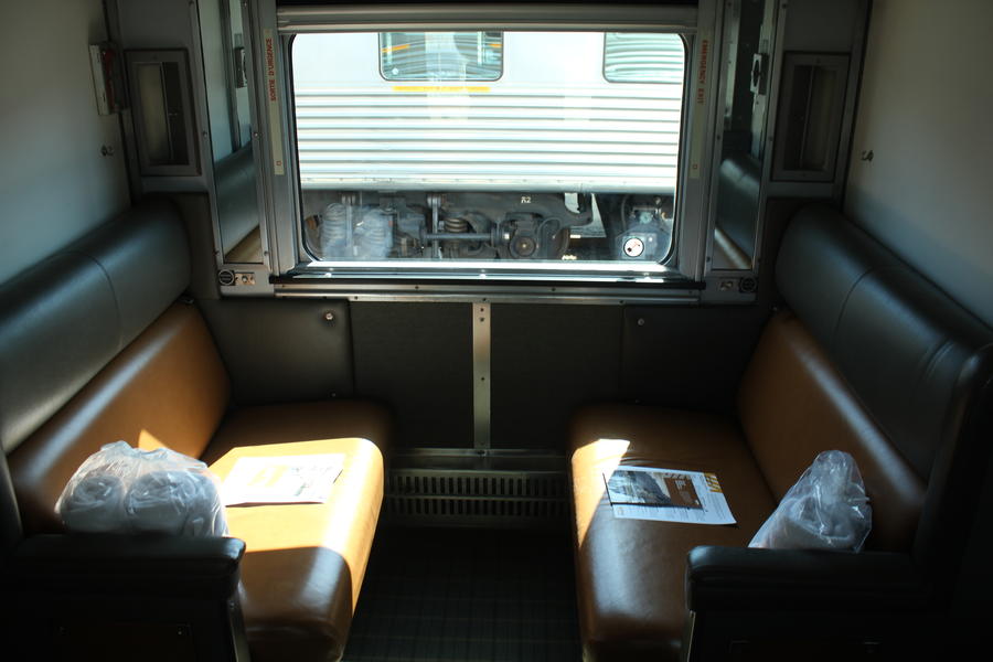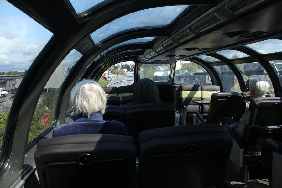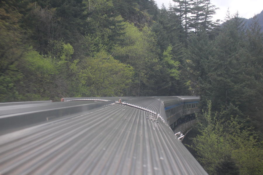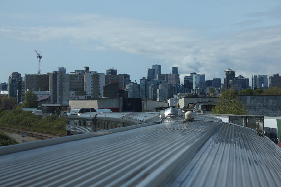 Danach ging es über das Hotel, Gepäck abholen, zum Bahnhof. Dort zeigt sich, dass der Zug "in Season" doch nochmal eine andere Hausnummer ist als "out of Season". Der Zug wird an zwei Bahnsteigen parallel geboarded, da er für einen Bahnsteig zu lang ist, es gibt zwei Speisewagen und zusätzlich drei statt zwei Seatings - also wird letztlich in sechs statt in zwei Schichten an Board gegessen. Da ich heute noch nichts richtig gegessen hatte, entschied ich mich für Abendessen um fünf. Beim Boarding wurde ich von unserer zuständigen "Wagenbegleiterin" als Notfalltüröffner auserkoren und lernte so, wie die Türen des Canadian funktionieren. Und dann ging es endlich los und wir verließen Vancouver - und ich hab mich in den Dome verzogen.