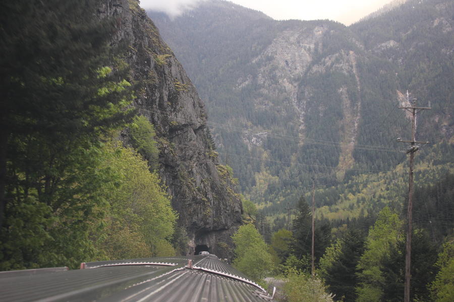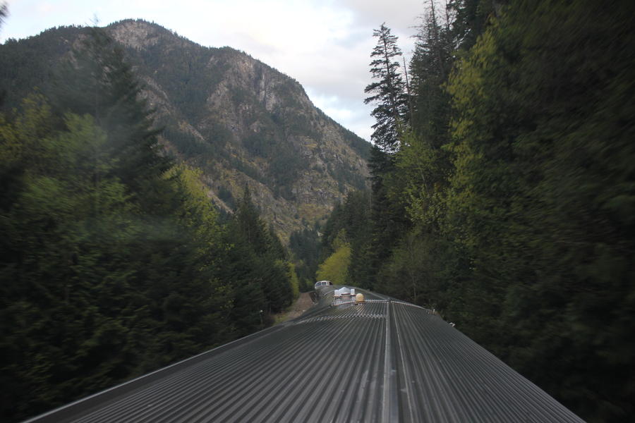 Zum Abendessen gab es eine leckere Butternusskürbissuppe, gefolgt von zarten Lamm-Rippchen mit Gemüse und Reis und zum Nachtisch ein mächtiger Schokokuchen. Danach ging es wieder in den Dome und Landschaft gucken, während der Activity Coordinator (Zugbegleiter im Dome-Car, der für Erklärungen, Vorträge und Unterhaltungsprogramm zuständig ist) einen unterhaltsamen Vortrag "Das kleine Eisenbahn-1-mal-1" hielt. Auch wenn das meiste für mich nicht neu war, war es unterhaltsam und das ein oder andere neue hat man dann doch aufgeschnappt - dass Güterzüge ewig lang sind und dabei über 100 Wagen haben, wusste ich - dass sie bis zu 3 Meilen (knapp 5km) lang sein dürfen, war mir neu. Im Tal des Fraeser-Flusses konnte man auf der anderen Seite des Tals "die andere" Trans-Canada-Eisenbahnstrecke beobachten - wir fuhren auf der Canadian Pacific-Strecke und konnten die Strecke von Canadian National beobachten. In dem Bereich der Parallelführung der Strecken wird die Canadian Pacific-Strecke für den eastbound traffic genutzt, während der Verkehr nach Westen auf der Strecke von Canadian National fährt. Sobald die Strecken nicht mehr parallel geführt werden, werden die jeweils eingleisigen Strecken wieder für den Verkehr in beide Richtungen genutzt - und man darf an Ausweichstellen aufeinander warten. Highlight war "Hells Gate", die schmalste Stelle des Tals.